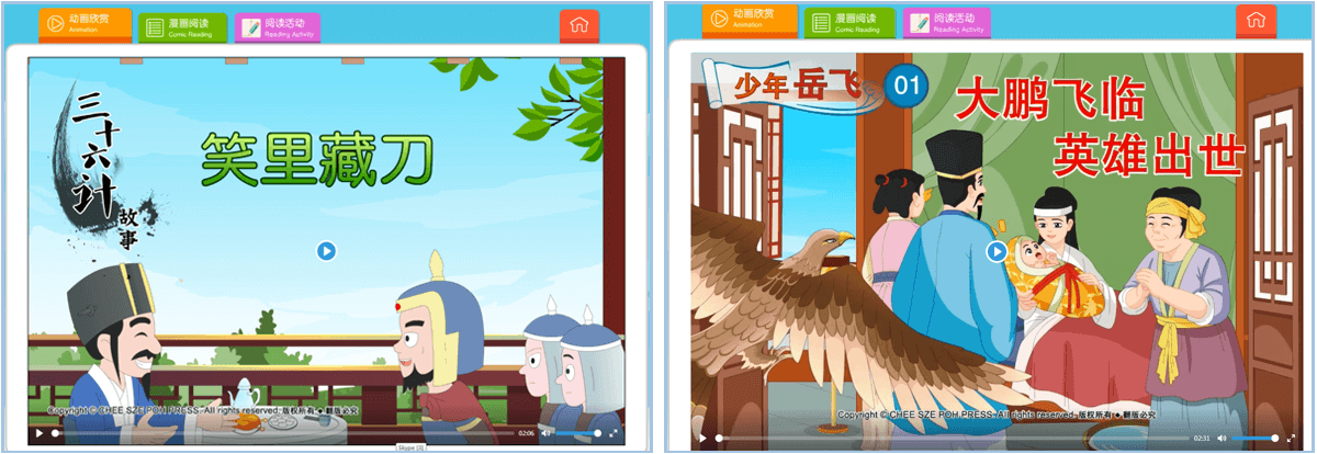 Currently, The stories available include “Three Kingdoms Story (Part 1 and 2)”, “Thirty-Six Stratagems”, “The Patriot Yue Fei”.